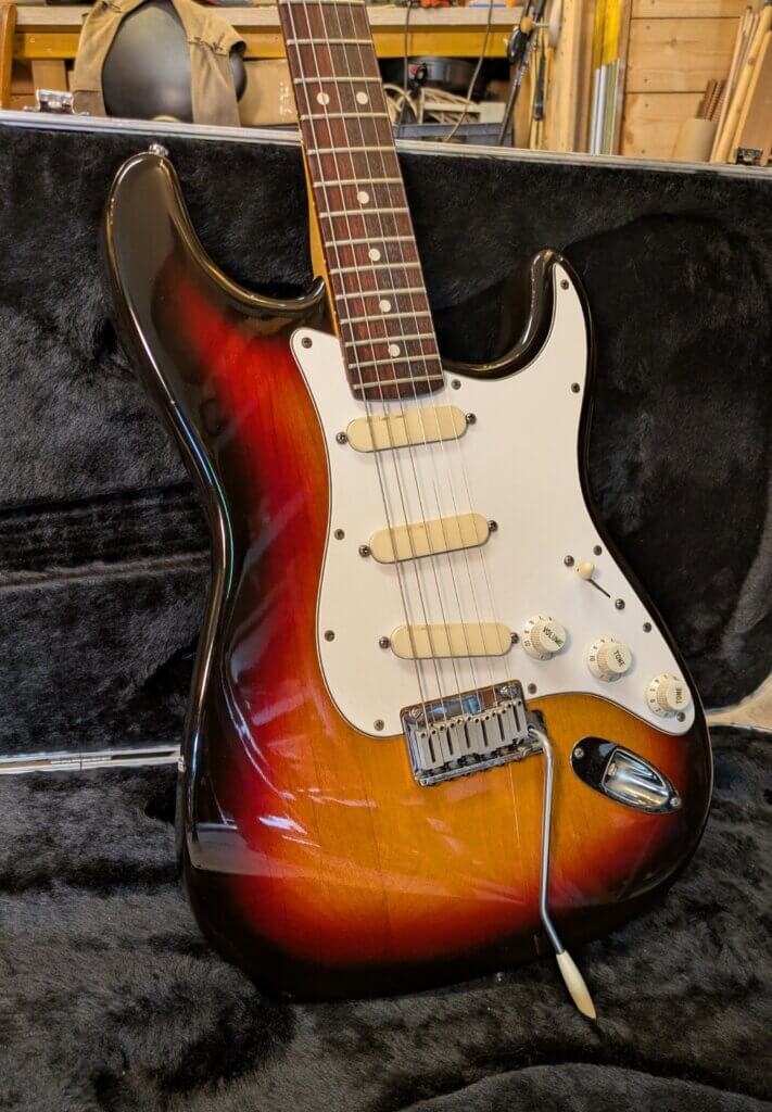 ( neck stamp 1989 et serial 84’), dans sa très élégante finition Sunburst 3 tons, 100 % d’origine, livrée avec son étui Fender thermo-moulé d’époque.
